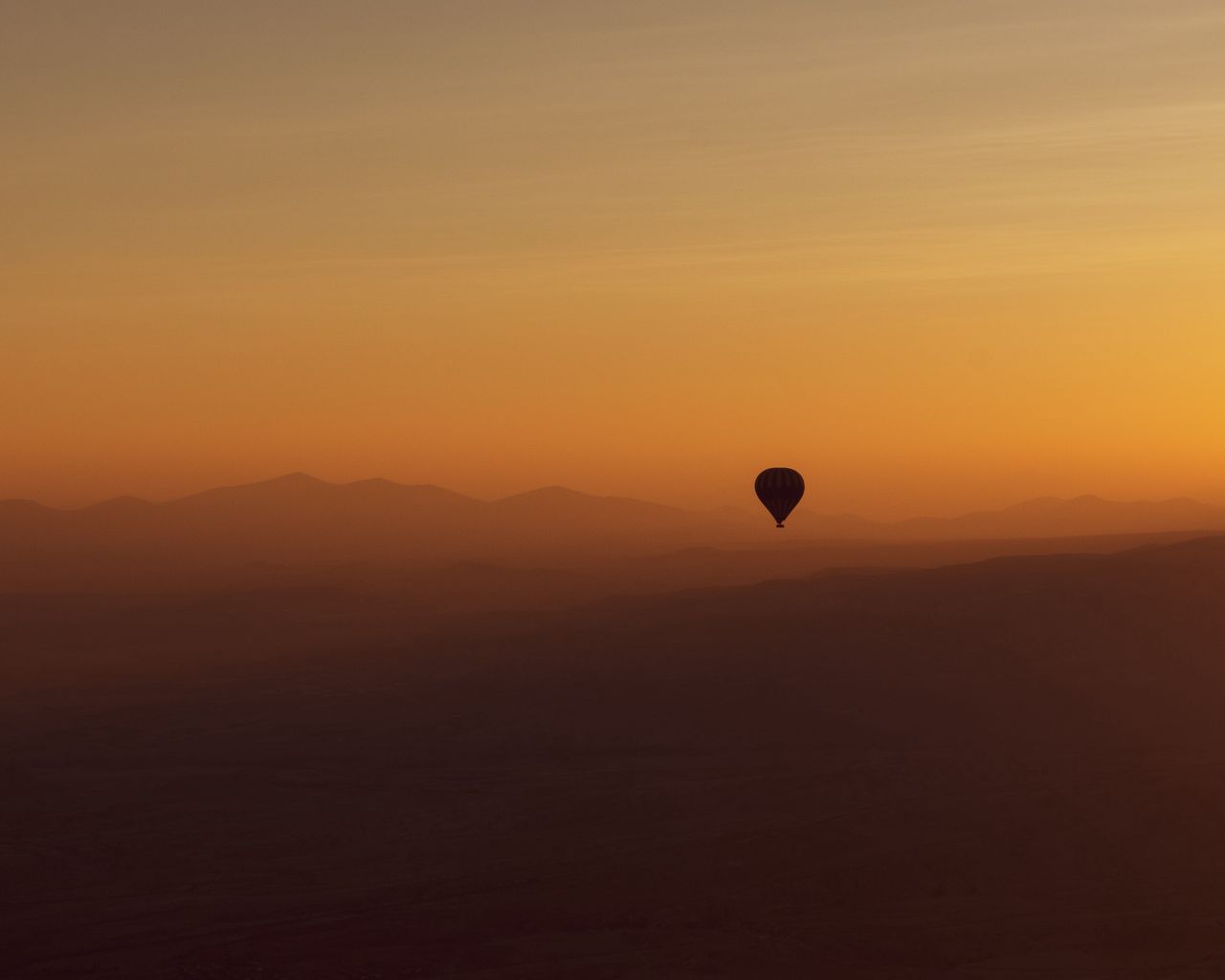 Download 1280x1024 air balloon, mountains, sunset, dusk, fog wallpaper, background standard 5:4
