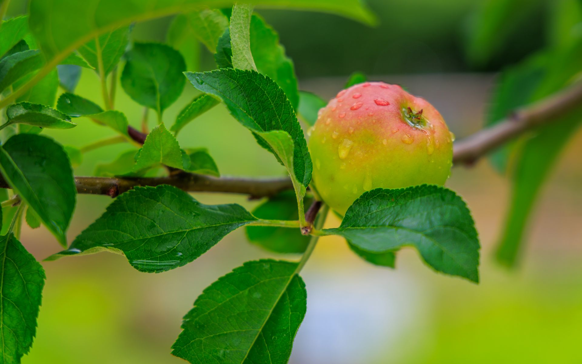 Download 1920x1200 apple, leaves, branches, drops, macro wallpaper, background widescreen 16:10
