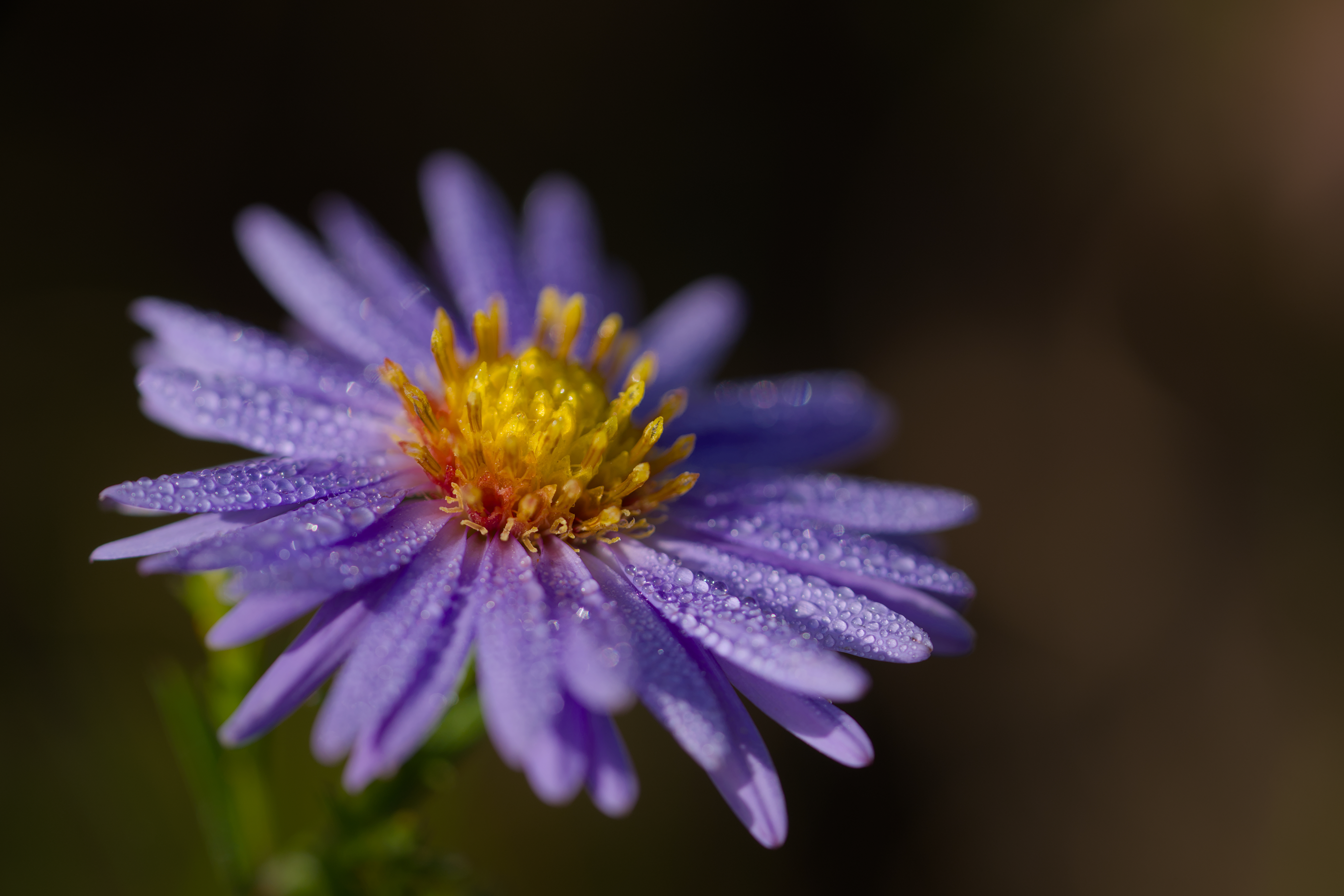 Download 7899x5266 aster, flower, petals, drops, macro, pollen wallpaper, background