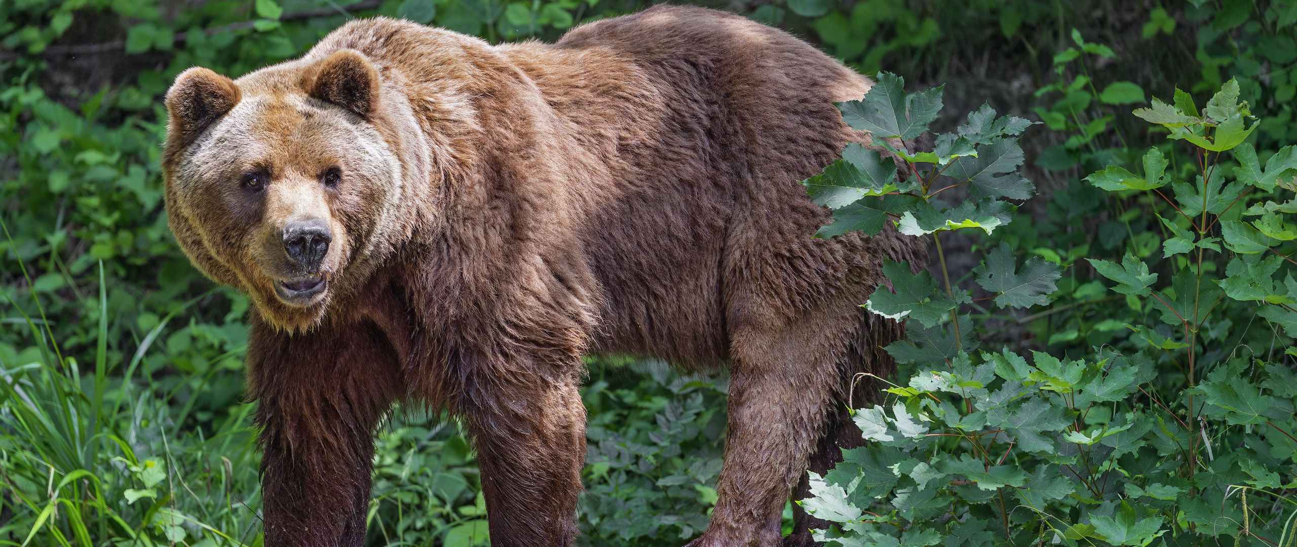 Download 2560x1080 bear, log, leaves, forest, animal, nature wallpaper, background dual wide 1080p