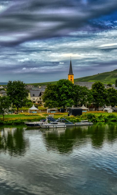 Download 480x800 bridge, river, motor ships, buildings, trees, clouds, landscape wallpaper, background nokia x, x2, xl, 520, 620, 820, samsung galaxy star, ace, asus zenfone 4