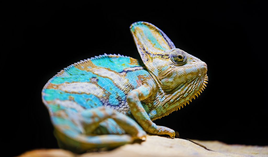 Download 1024x600 chameleon, reptile, lizard, glance, turquoise wallpaper, background netbook, tablet