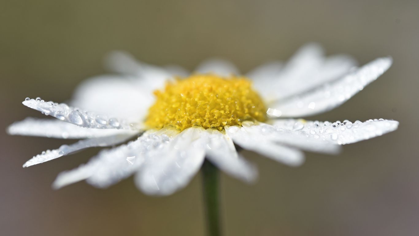 Download 1366x768 chamomile, drops, flower, petals, macro wallpaper, background tablet, laptop