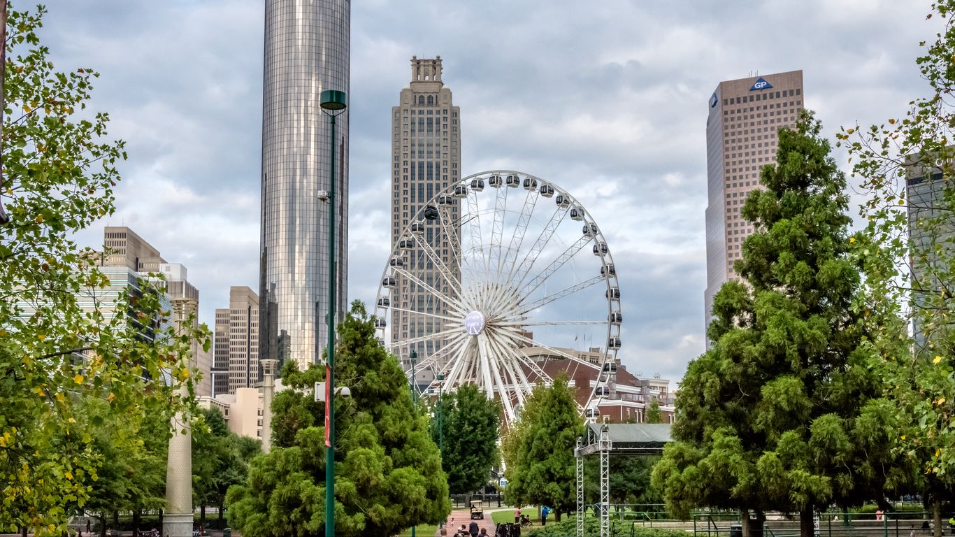 Download 1366x768 city, buildings, architecture, ferris wheel, attraction wallpaper, background tablet, laptop