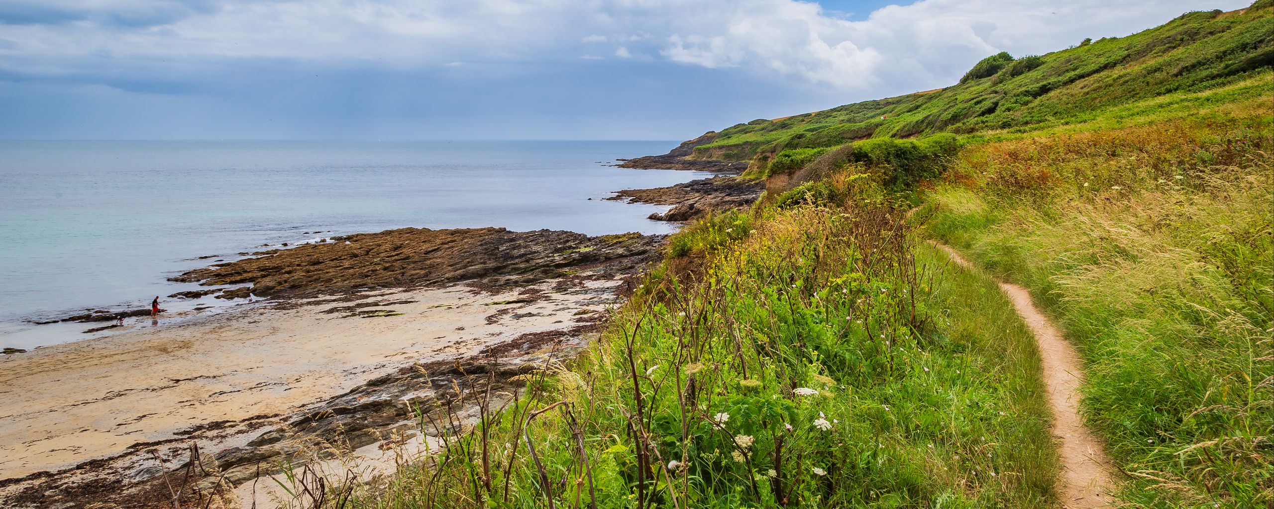 Download 2560x1024 coast, grass, sea, landscape, nature, clouds wallpaper, background ultrawide monitor