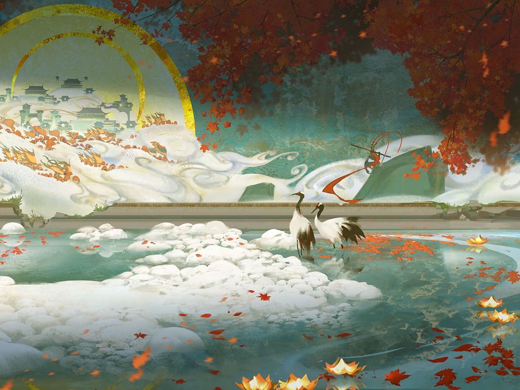 Download 1024x768 cranes, pond, maple, leaves, autumn, art wallpaper, background standard 4:3