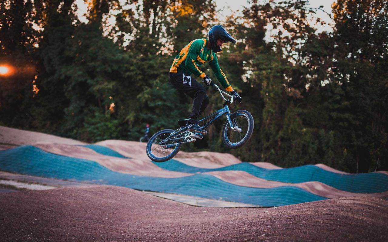 Download 1280x800 cyclist, stunt, jump, helmet, cycle track wallpaper, background widescreen 16:10