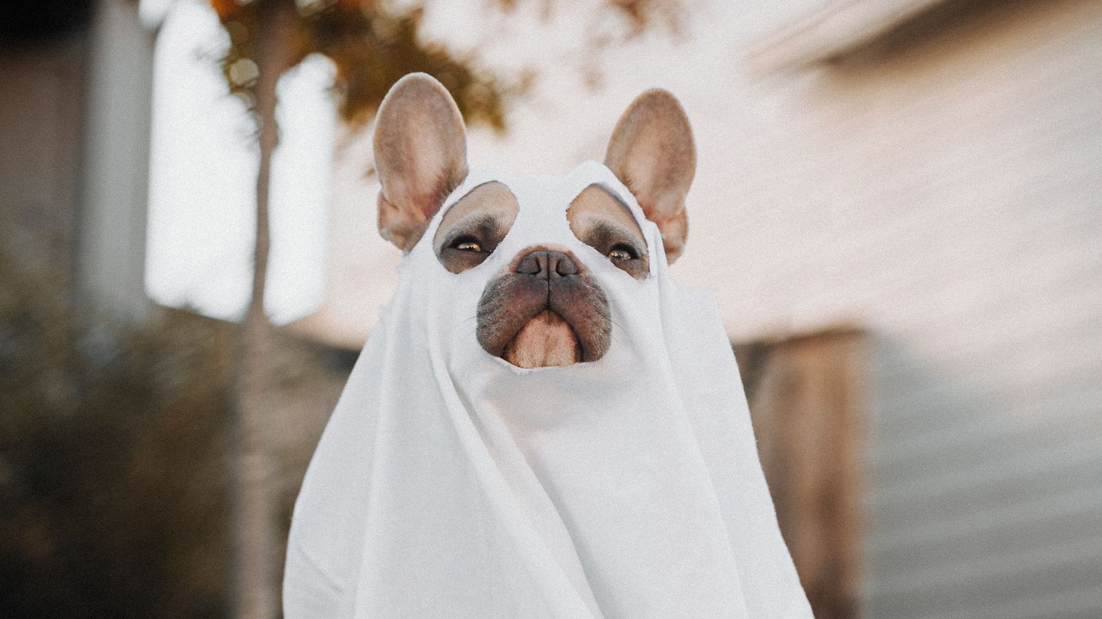 Download 1600x900 dog, cape, ghost, pet wallpaper, background widescreen 16:9