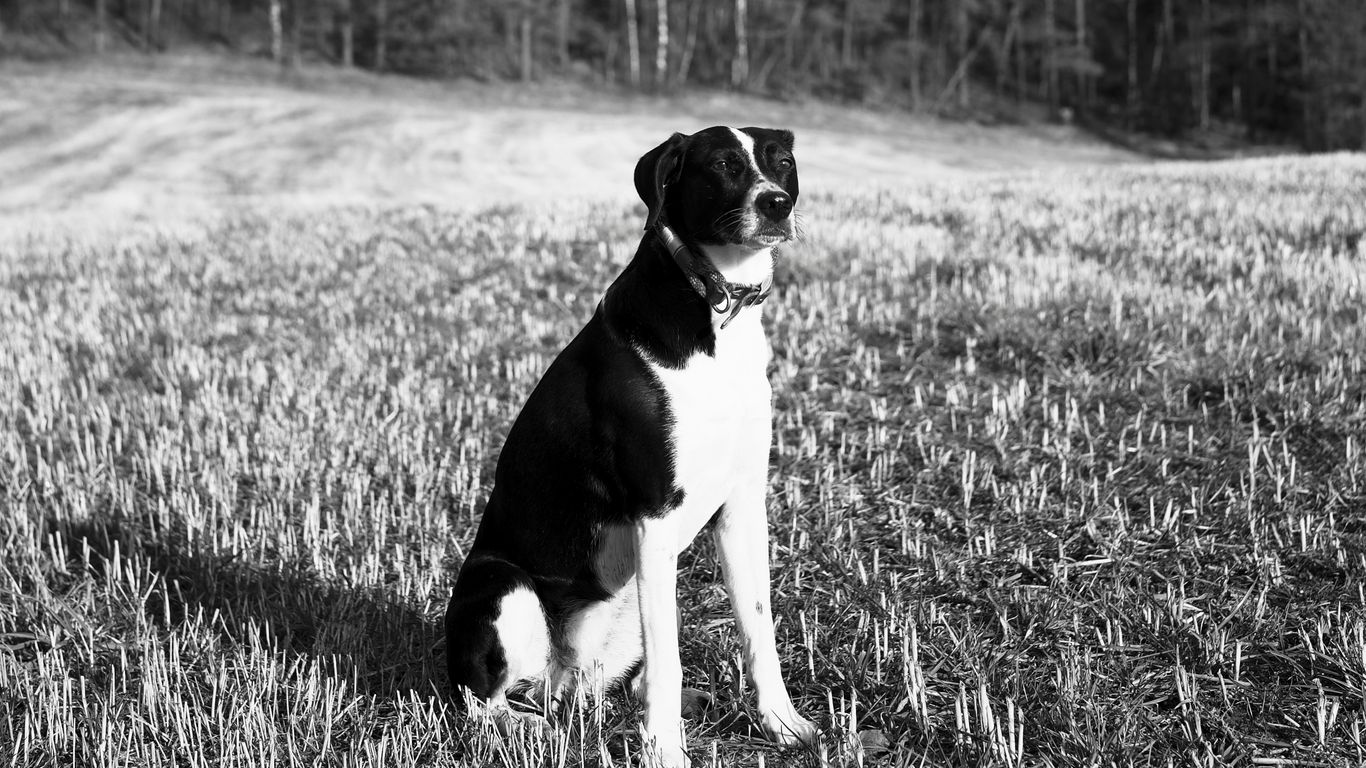 Download 1366x768 dog, pet, ield, forest, bw wallpaper, background tablet, laptop