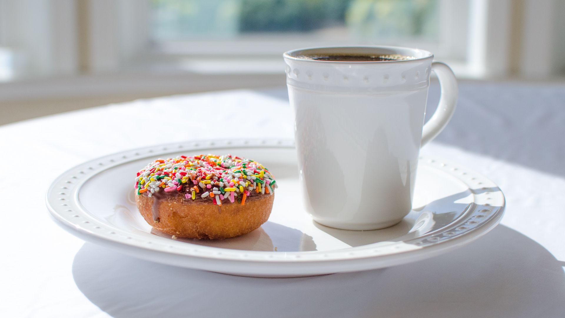 Download 1920x1080 donut, sprinkling, dessert, cup, tea wallpaper, background full hd, hdtv, fhd, 1080p