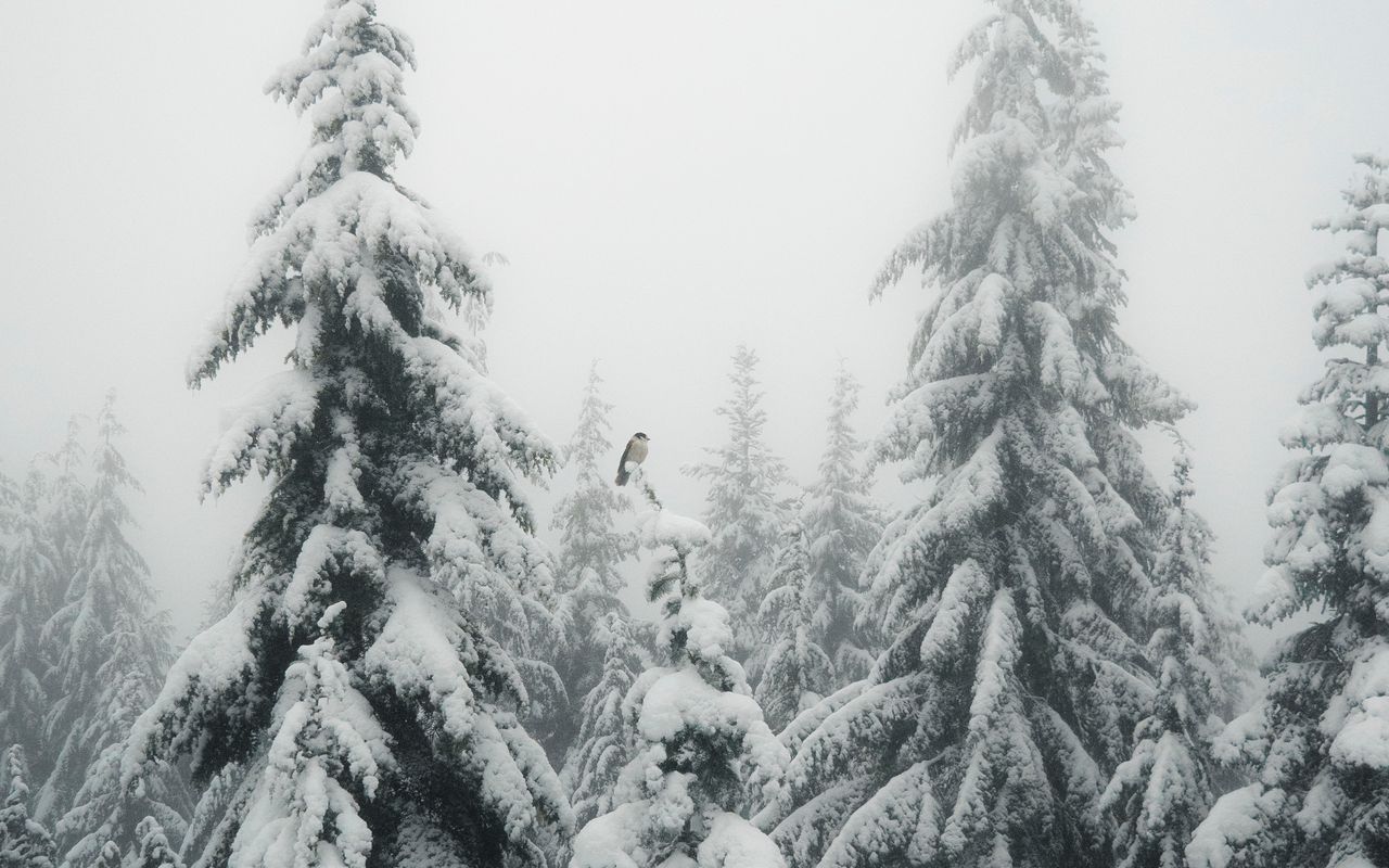 Download 1280x800 fir, fog, snow, bird, winter wallpaper, background widescreen 16:10