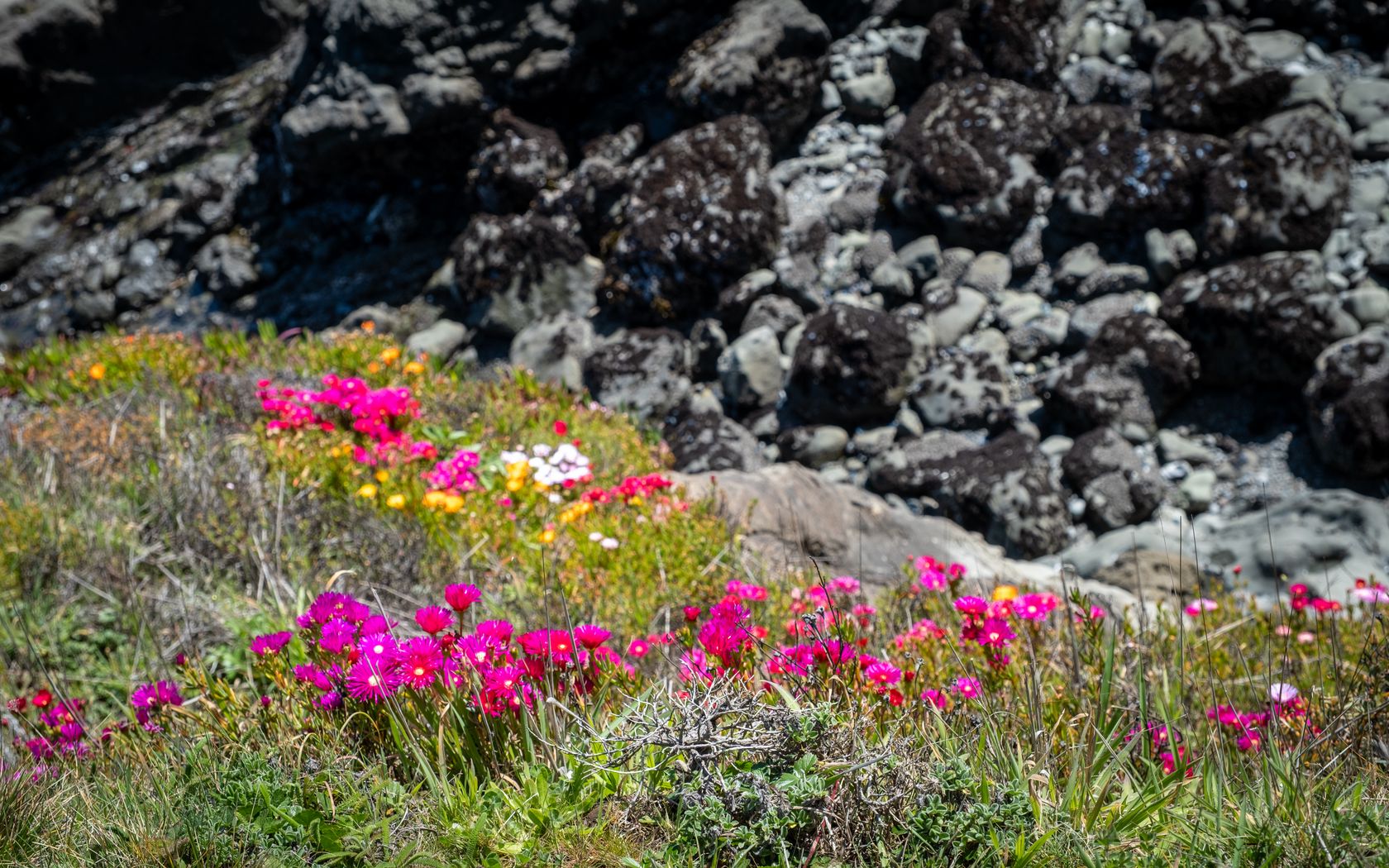 Download 1680x1050 flowers, grass, stones, nature wallpaper, background widescreen 16:10
