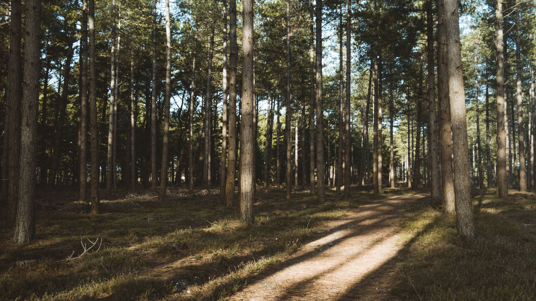 Download 2048x1152 forest, conifer, pines, path, trees wallpaper, background ultrawide monitor
