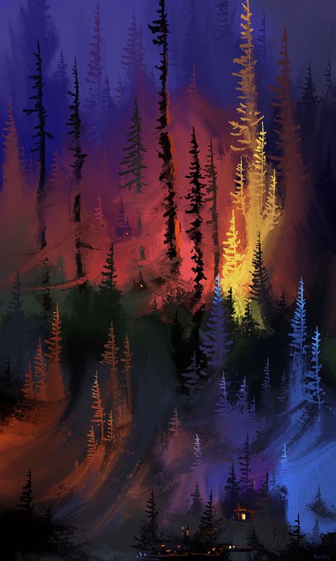 Download 480x800 forest, trees, house, lights, art wallpaper, background nokia x, x2, xl, 520, 620, 820, samsung galaxy star, ace, asus zenfone 4