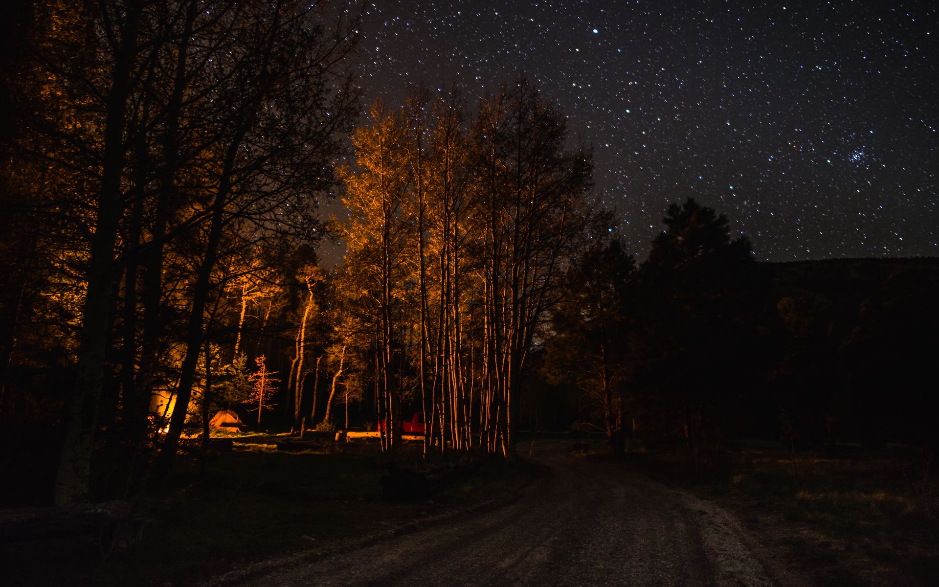 Download 1920x1200 forest, trees, tent, light, dark wallpaper, background widescreen 16:10