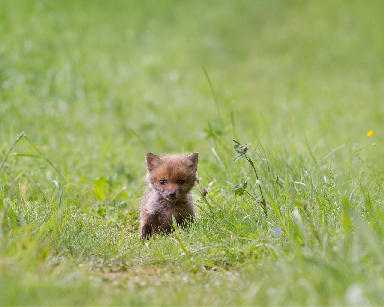 Download 1280x1024 fox, cub, grass wallpaper, background standard 5:4