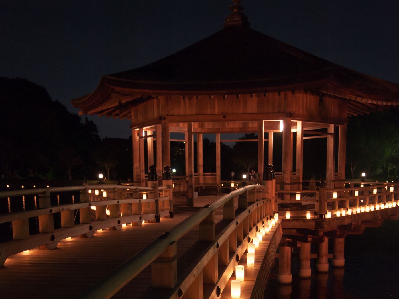 Download 1400x1050 gazebo, bridge, lights, water, dark wallpaper, background standard 4:3