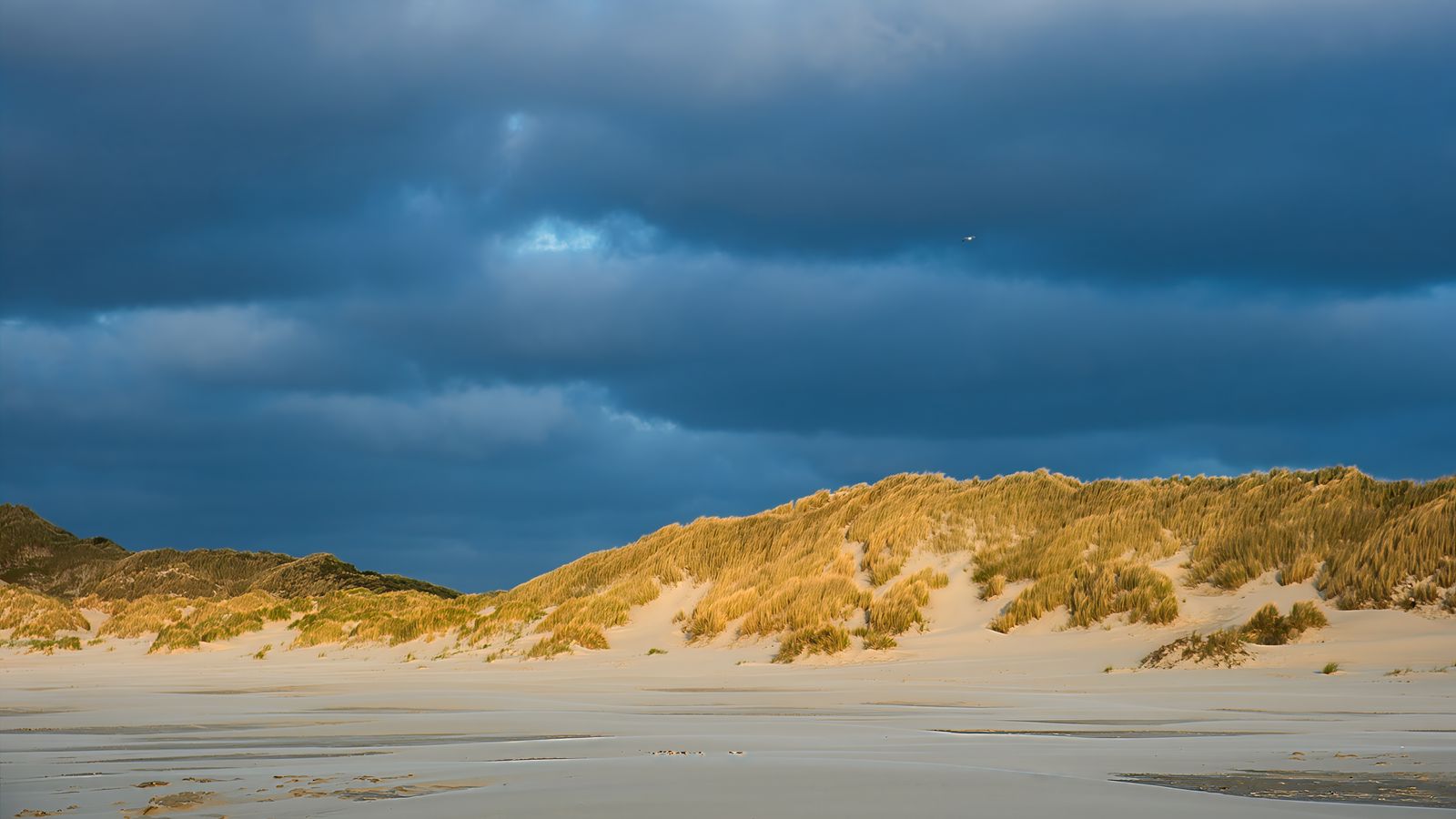 Download 1600x900 hills, beach, clouds, sky, dark, landscape wallpaper, background widescreen 16:9
