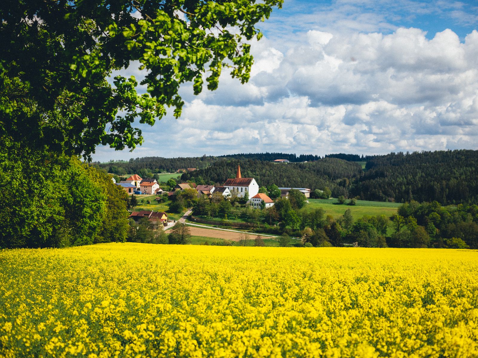 Download 1600x1200 houses, field, flowers, forest, landscape wallpaper, background standard 4:3