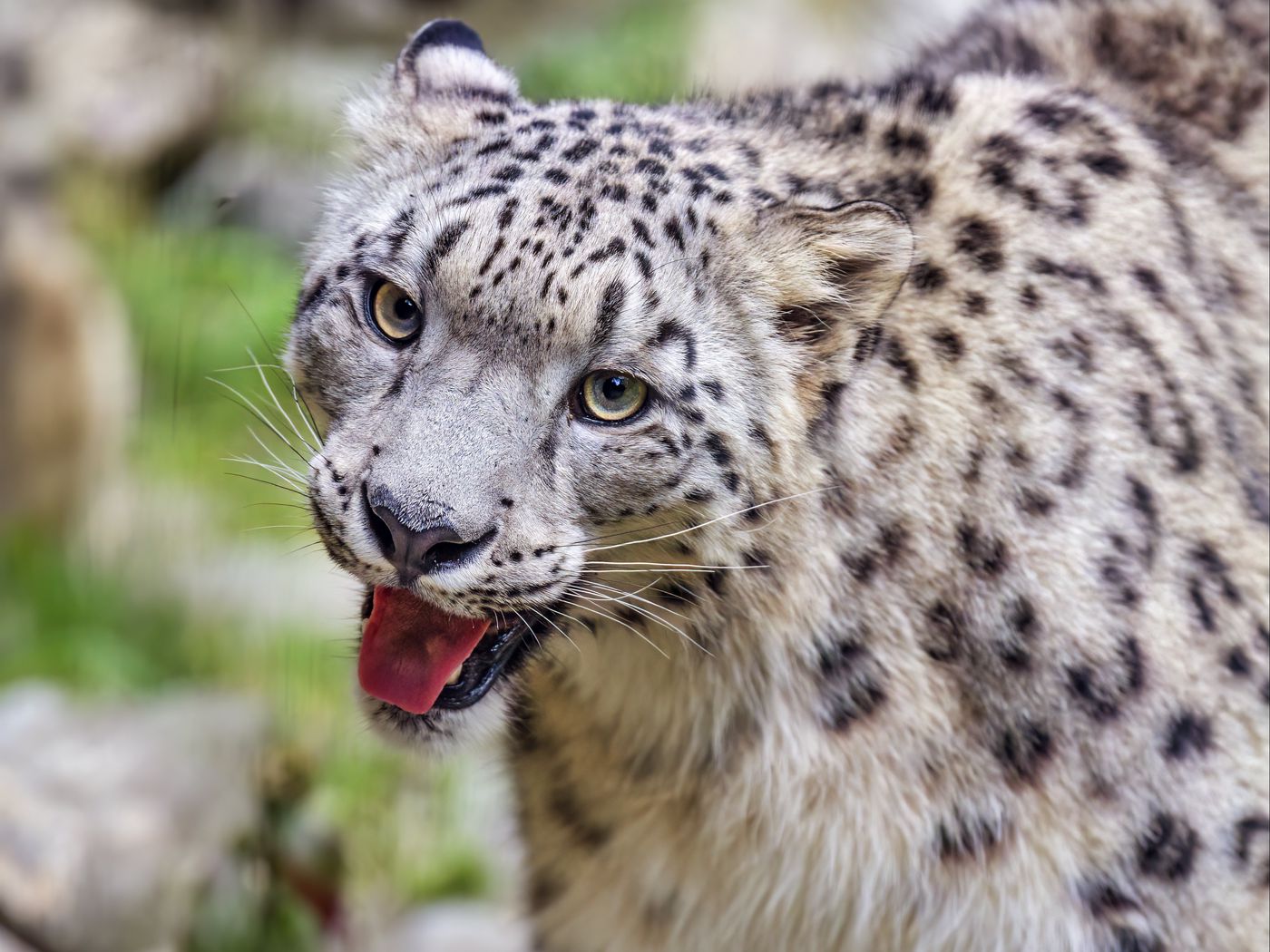 Download 1400x1050 irbis, protruding tongue, predator, big cat, animal, blur wallpaper, background standard 4:3