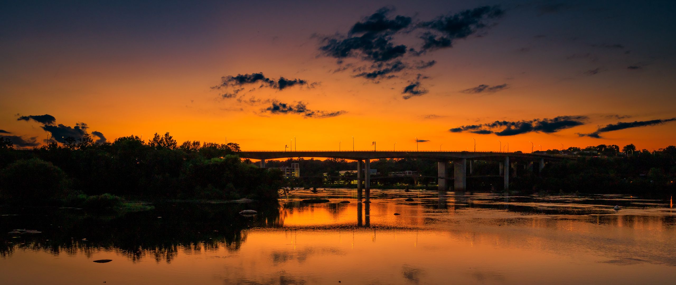 Download 2560x1080 lake, bridge, trees, clouds, sky, sunset, dark wallpaper, background dual wide 1080p