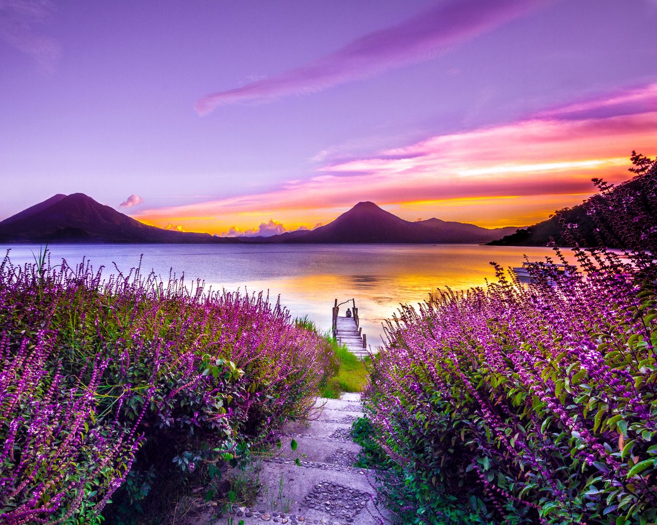 Download 1280x1024 lake, mountains, solitude, flowering, lake atitlan, guatemala wallpaper, background standard 5:4