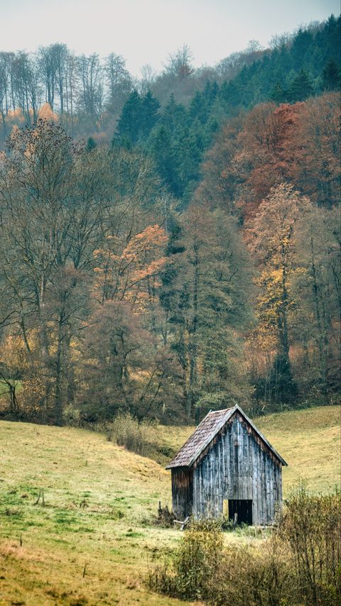 Download 480x854 landscape, forest, tree, autumn, barn, nature wallpaper, background nokia lumia 630, sony ericsson xperia