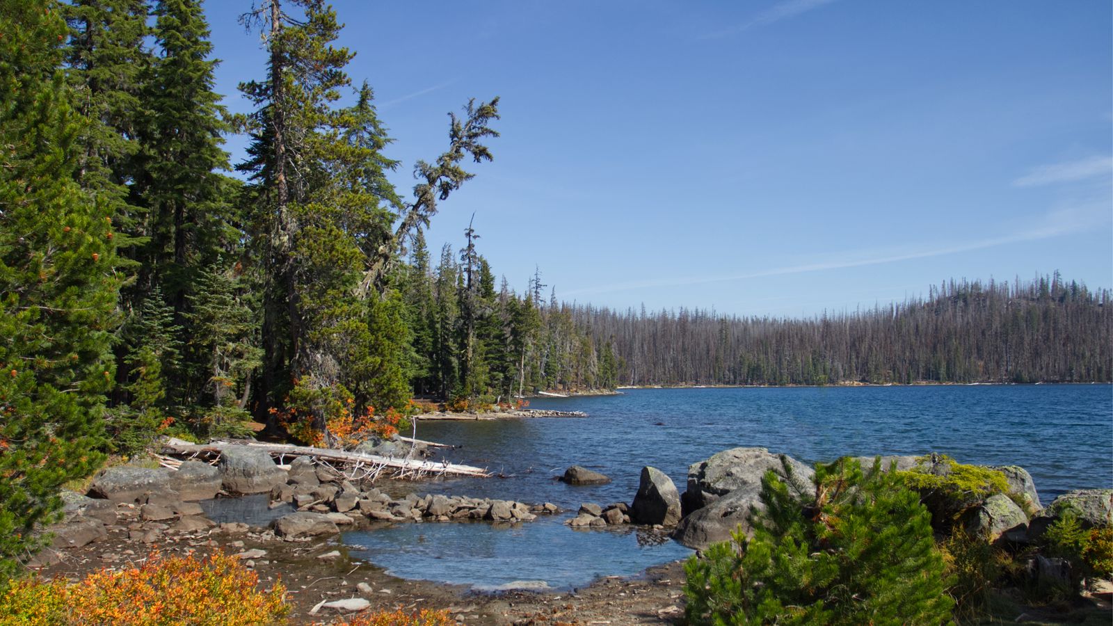 Download 1600x900 landscape, pond, forest, trees wallpaper, background widescreen 16:9