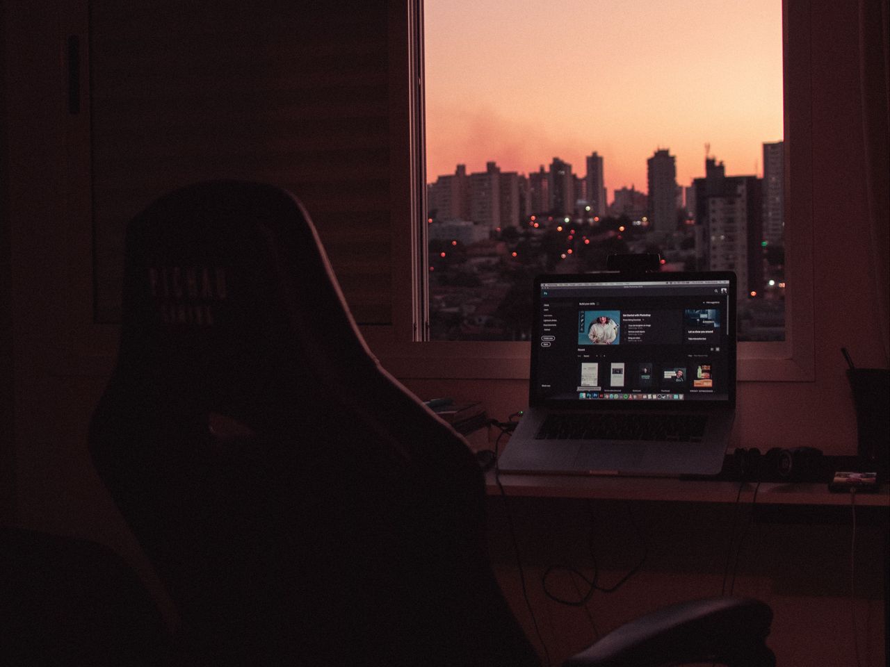 Download 1280x960 laptop, screen, desktop, desk, room, city wallpaper, background standard 4:3