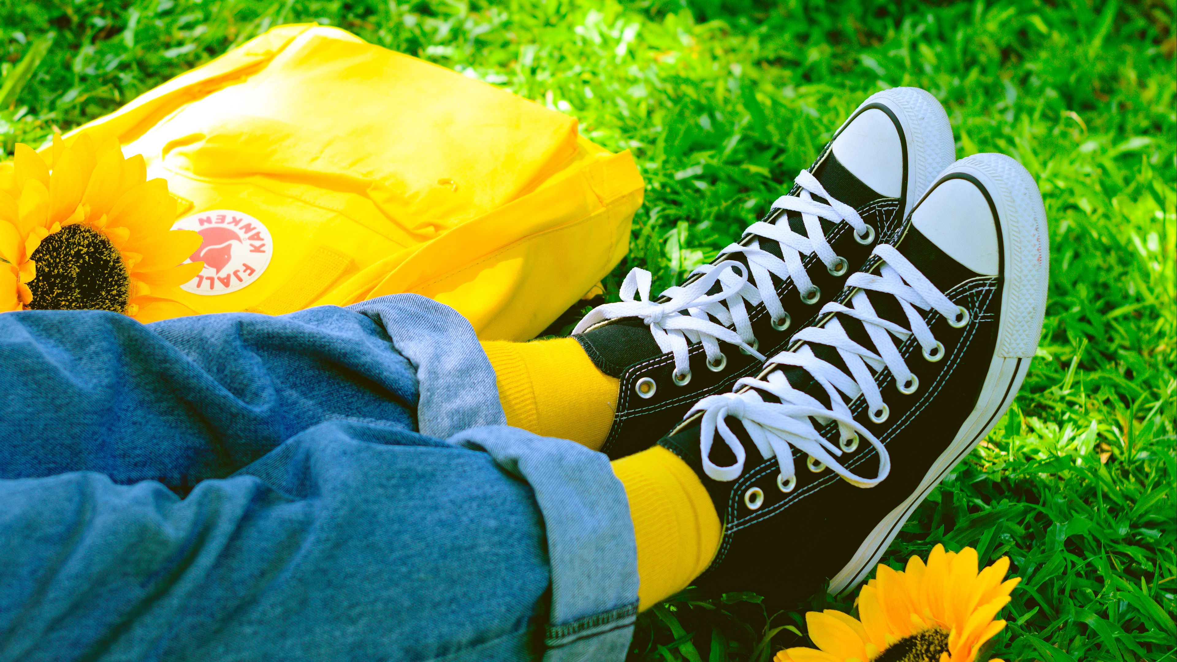 Download 3840x2160 legs, sneakers, summer, grass, yellow, flower wallpaper, background 4k uhd 16:9