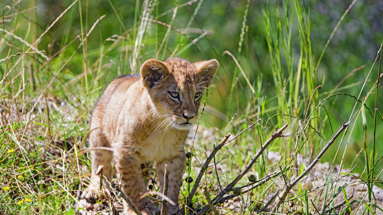 Download 1280x720 lion, cub, glance, grass wallpaper, background hd, hdv, 720p