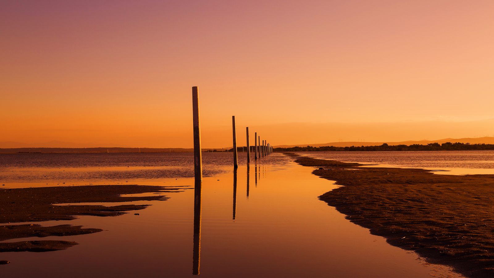 Download 1600x900 logs, water, reflection, horizon, twilight wallpaper, background widescreen 16:9