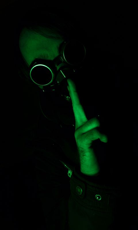 Download 480x800 man, glasses, mask, steampunk, backlight, green, dark wallpaper, background nokia x, x2, xl, 520, 620, 820, samsung galaxy star, ace, asus zenfone 4