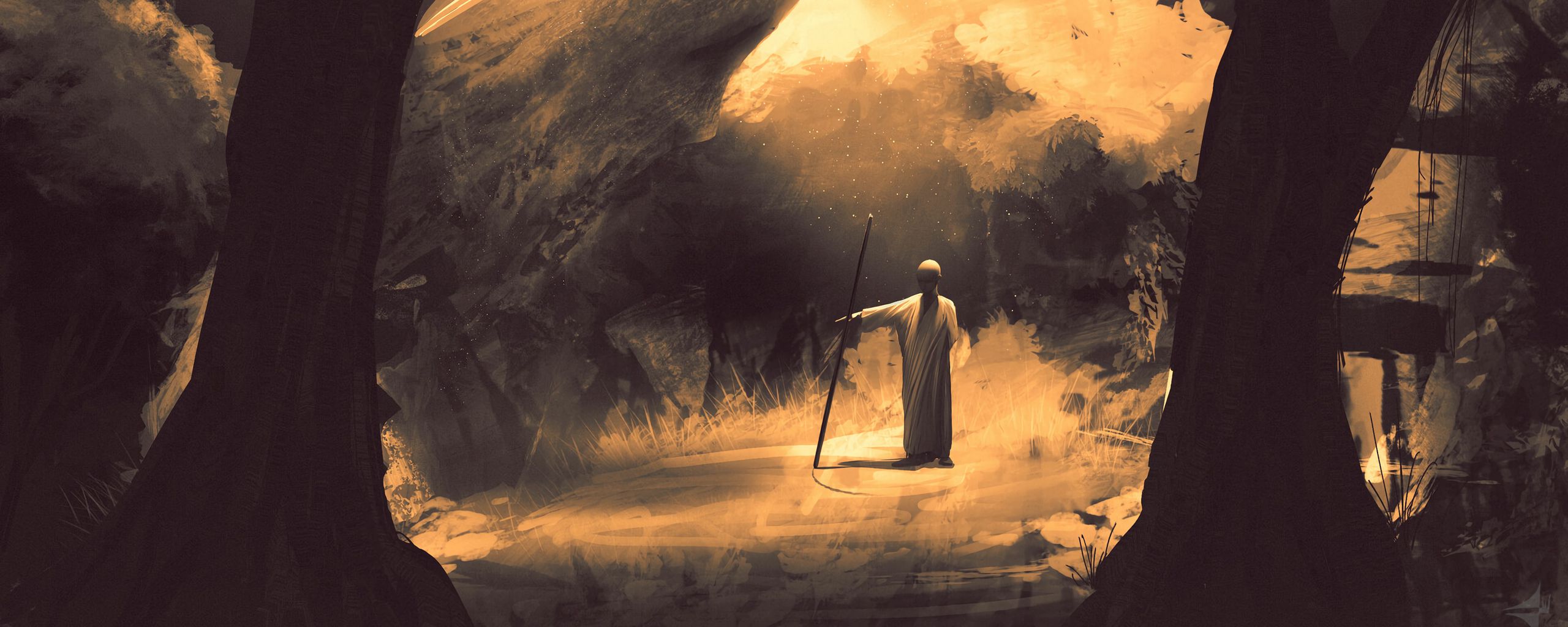 Download 2560x1024 monk, staff, forest, art wallpaper, background ultrawide monitor