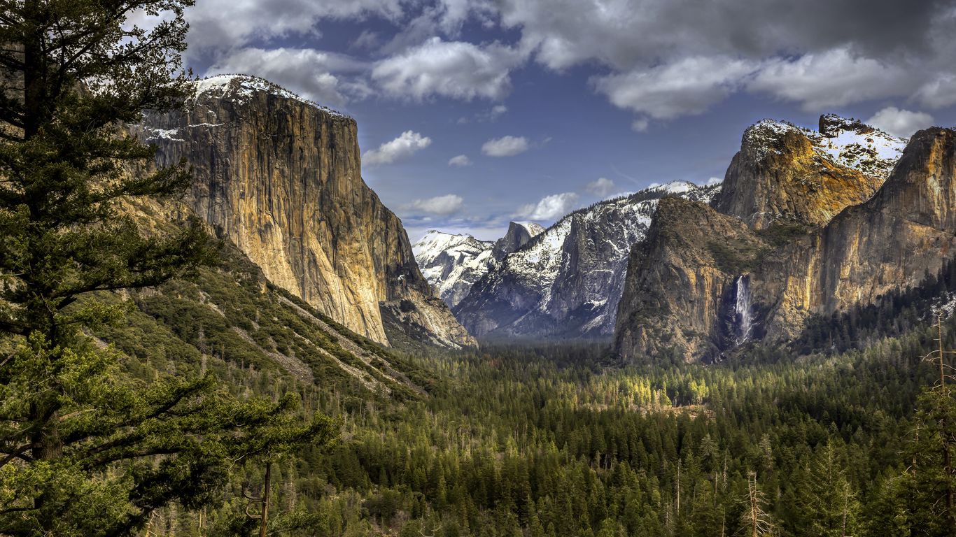 Download 1366x768 mountains, slope, trees, clouds, nature wallpaper, background tablet, laptop