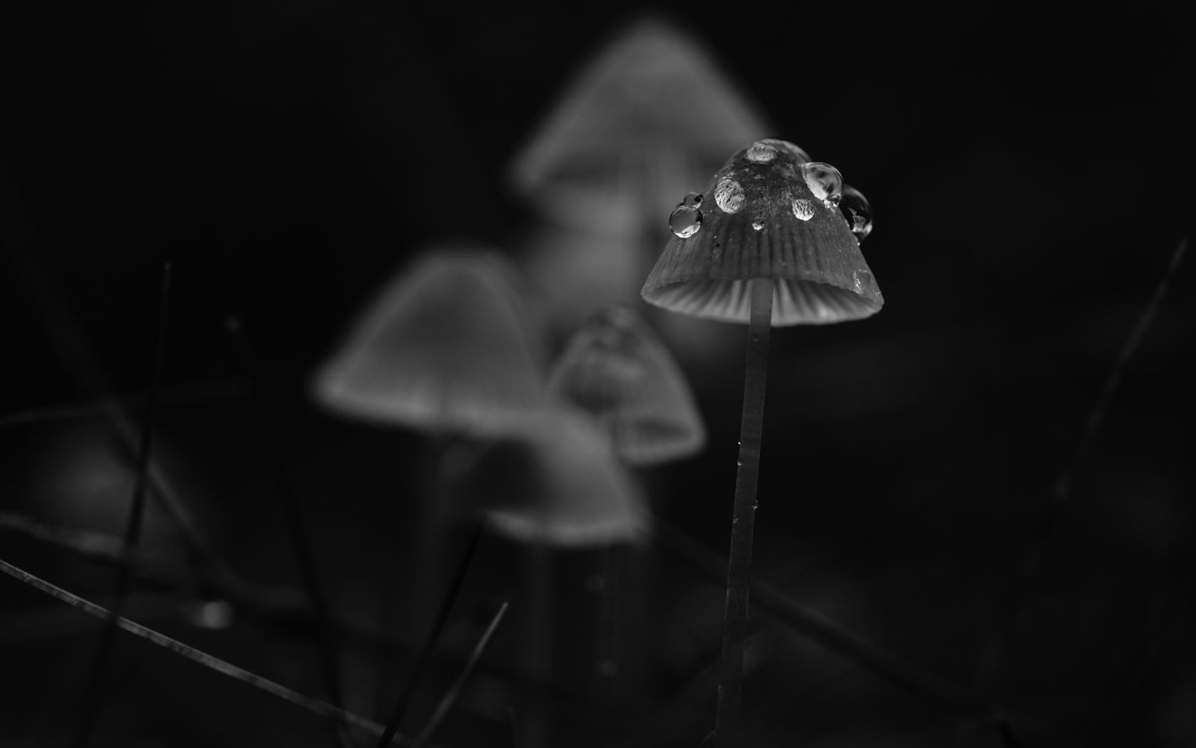 Download 1680x1050 mushrooms, drops, grass, dark, bw wallpaper, background widescreen 16:10