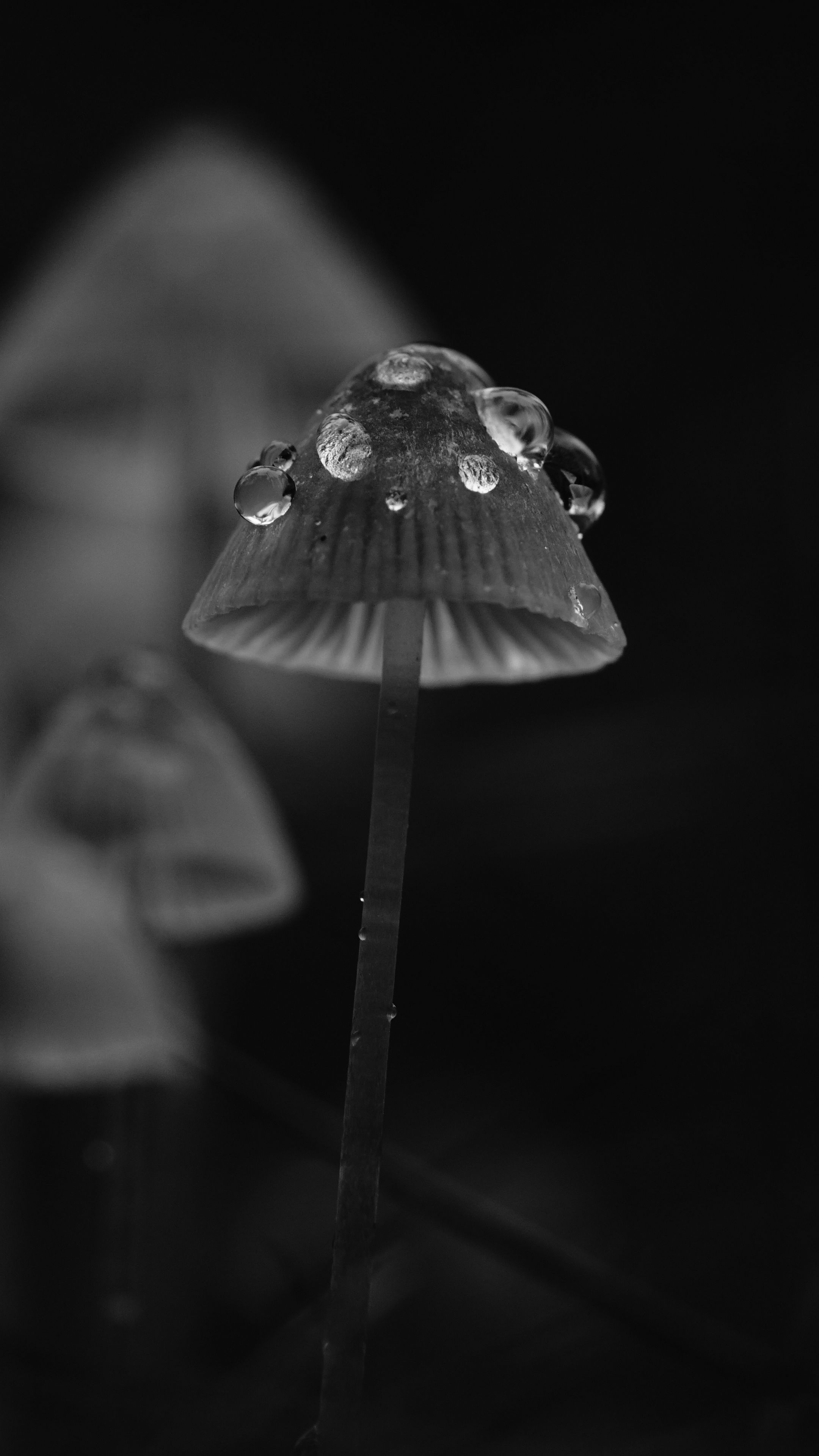 Download 2160x3840 mushrooms, drops, grass, dark, bw wallpaper, background samsung galaxy s4, s5, note, sony xperia z, z1, z2, z3, htc one, lenovo vibe
