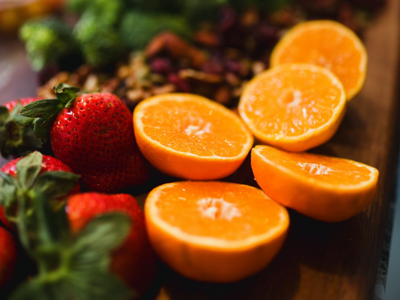Download 1400x1050 oranges, strawberries, fruits wallpaper, background standard 4:3