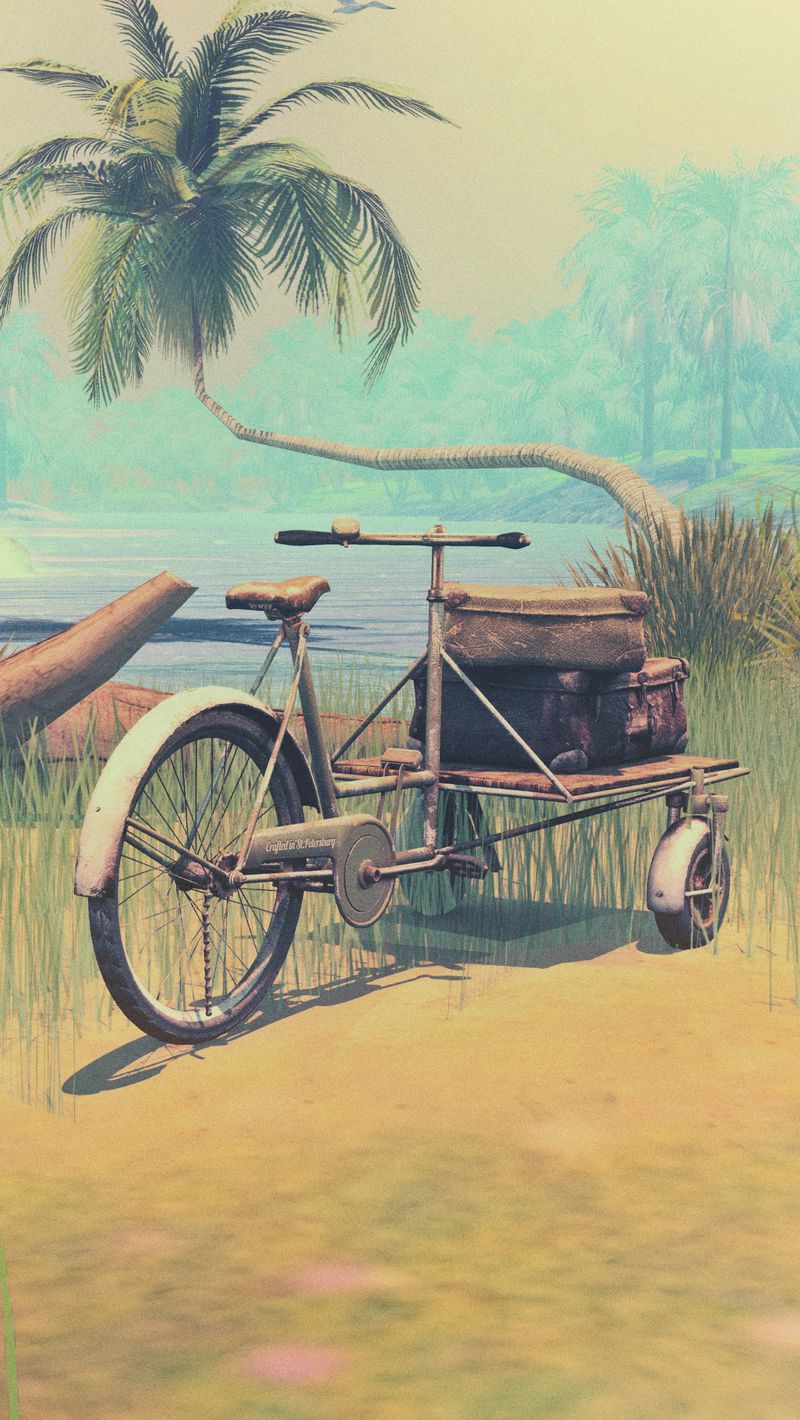 Download 800x1420 palm tree, art, lagoon, beach, bicycle, grass, wheel wallpaper, background iphone se/5s/5c/5 for parallax