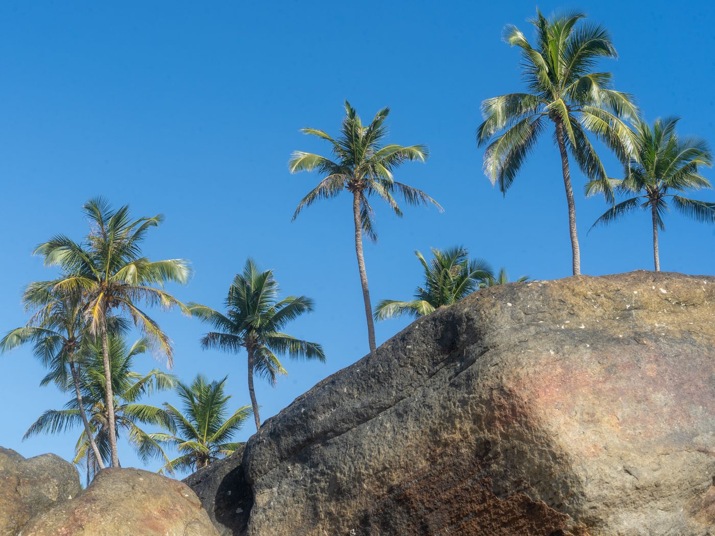 Download 1400x1050 palm trees, rocks, stones, tropics, sky wallpaper, background standard 4:3