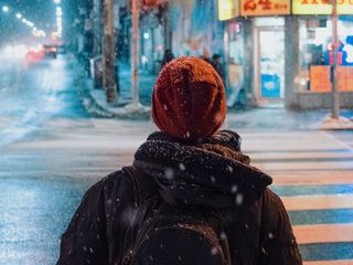 Download 320x240 person, street, night, snow, city wallpaper, background nokia e72, e71, asha, alcatel onetouch
