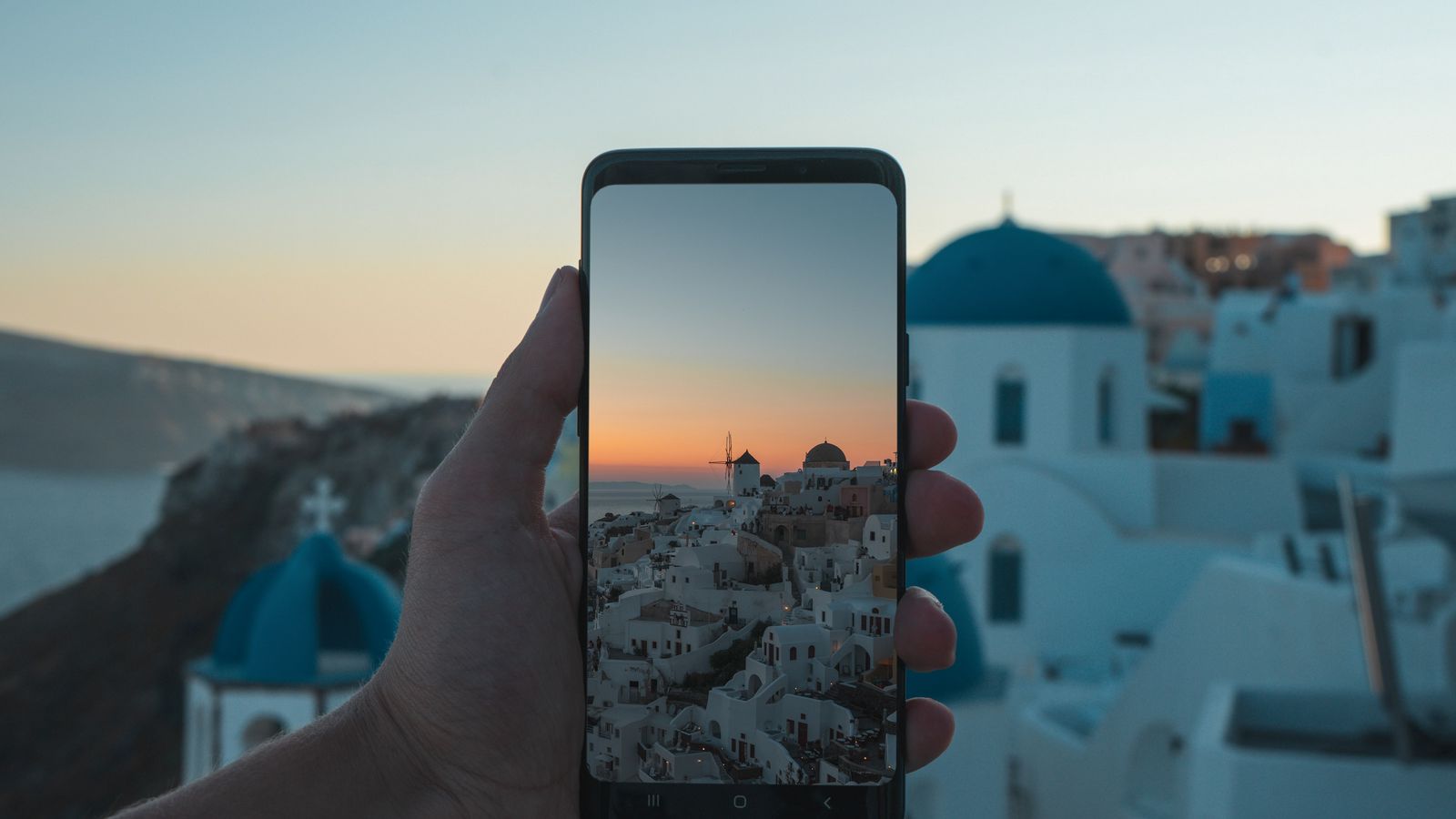 Download 1600x900 phone, hand, camera, city, sunset wallpaper, background widescreen 16:9
