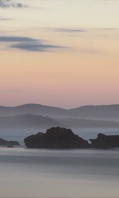 Download 240x400 rocks, sea, fog, hills, landscape, dawn wallpaper, background nokia asha 311, samsung galaxy 580, omnia, lg kp500