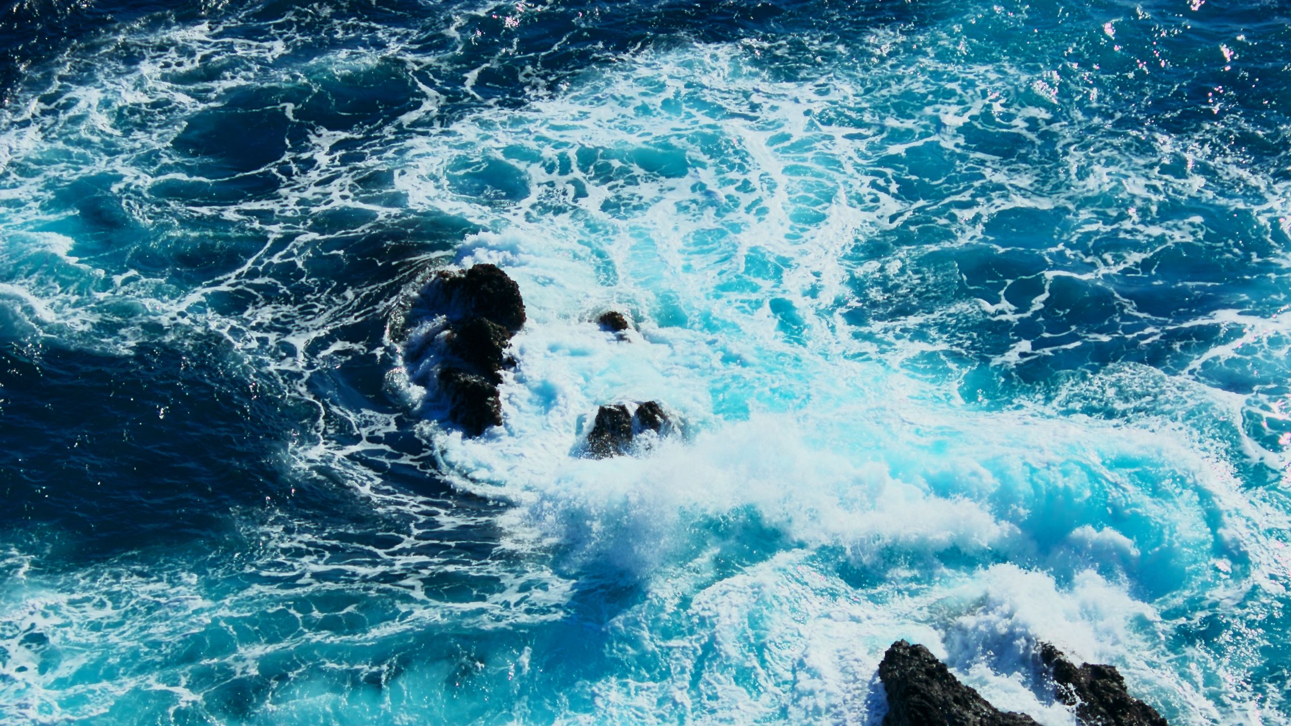 Download 2560x1440 sea, foam, stones, nature wallpaper, background widescreen 16:9