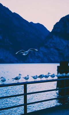 Download 240x400 seagulls, birds, railing, sea, shore wallpaper, background nokia asha 311, samsung galaxy 580, omnia, lg kp500
