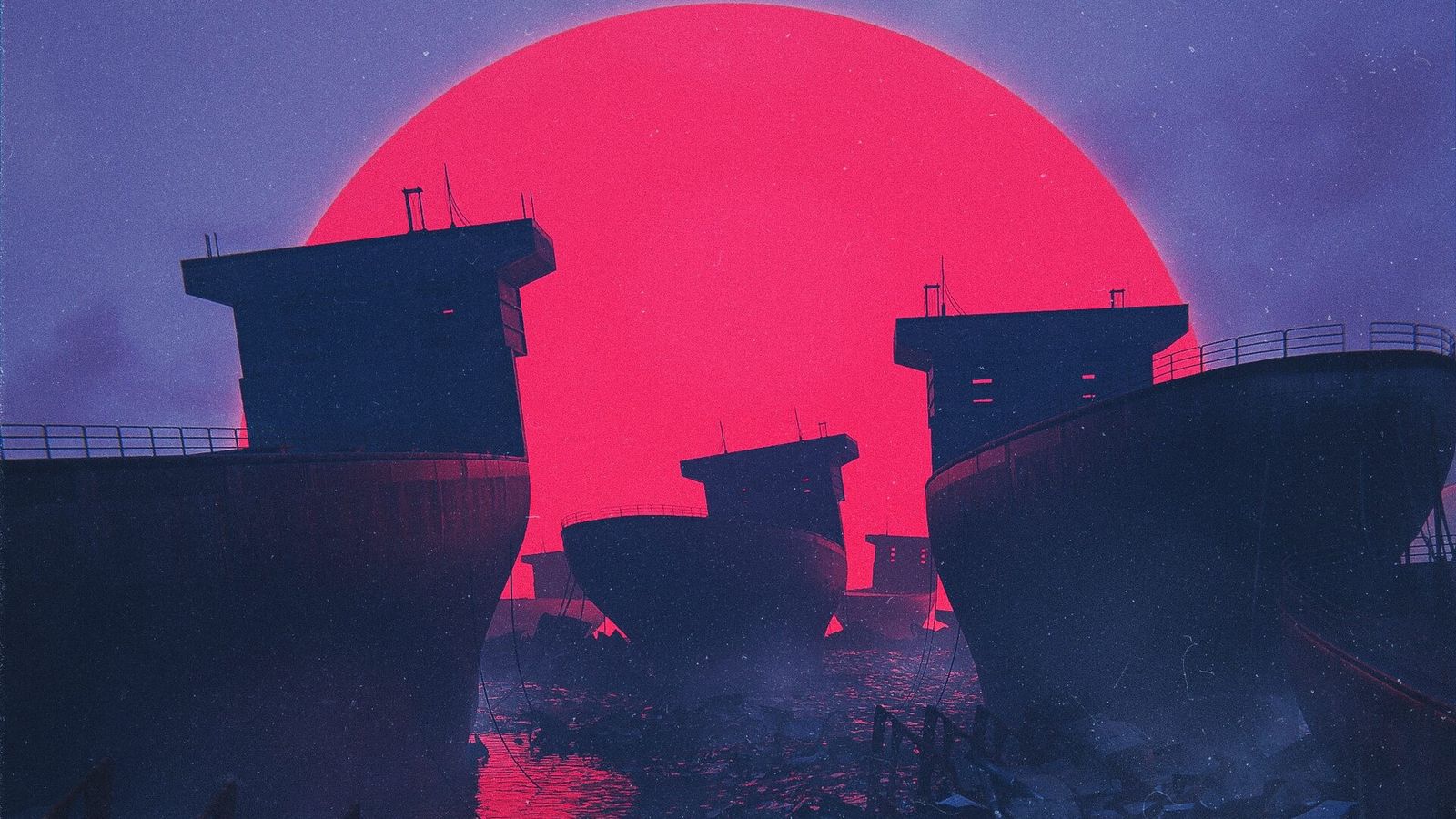 Download 1600x900 ships, sun, circle, ruins wallpaper, background widescreen 16:9