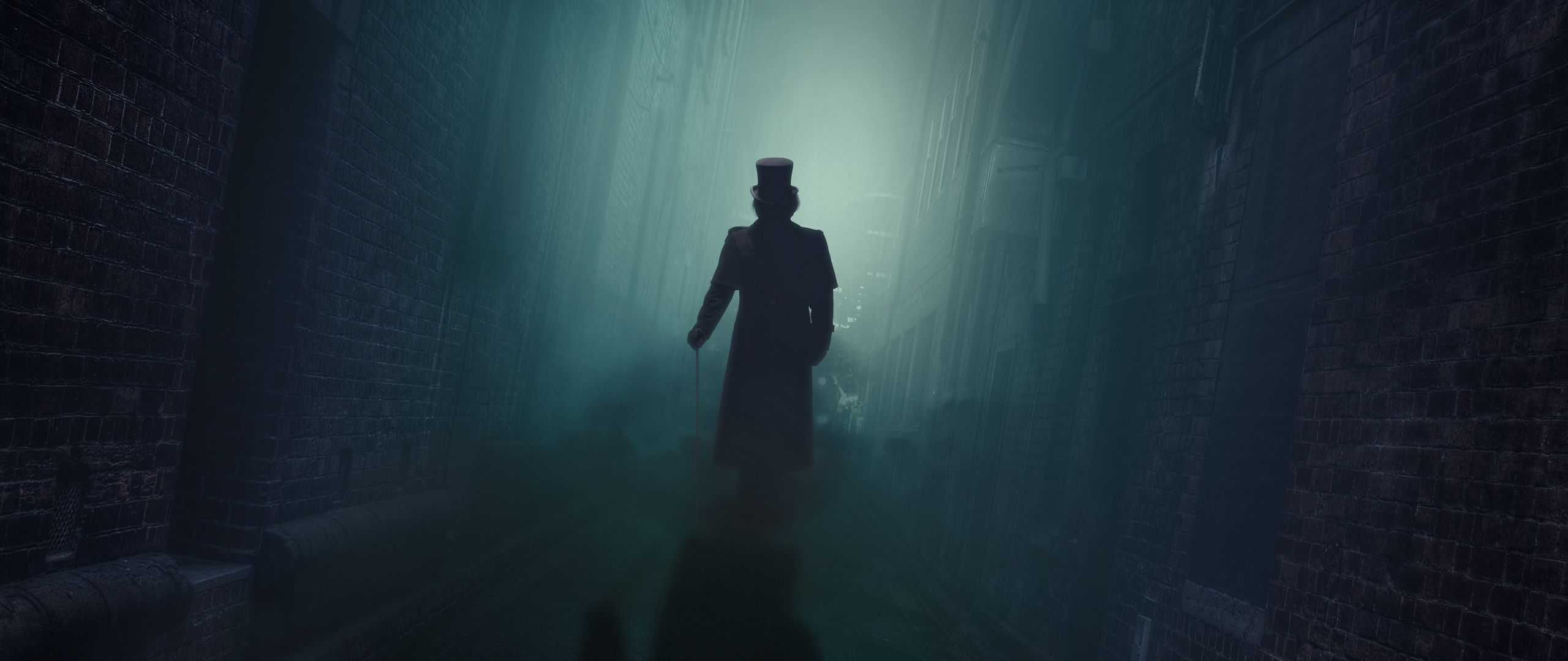 Download 2560x1080 silhouette, lane, night, fog, shadow, hat, cane, walk away wallpaper, background dual wide 1080p