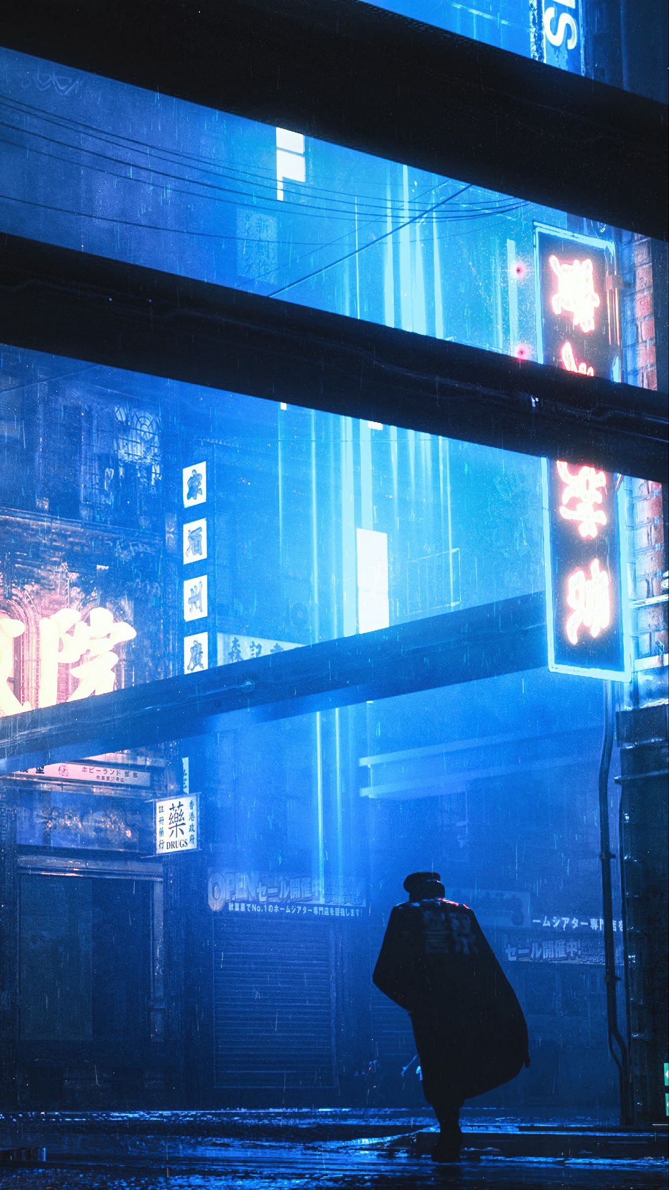 Download 1350x2400 silhouette, street, neon, night, signs, lights, rain wallpaper, background iphone 8+/7+/6s+/6+ for parallax