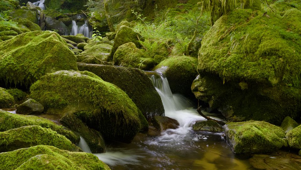 Download 960x544 stones, moss, greenery, waterfall, river, nature wallpaper, background playstation ps vita