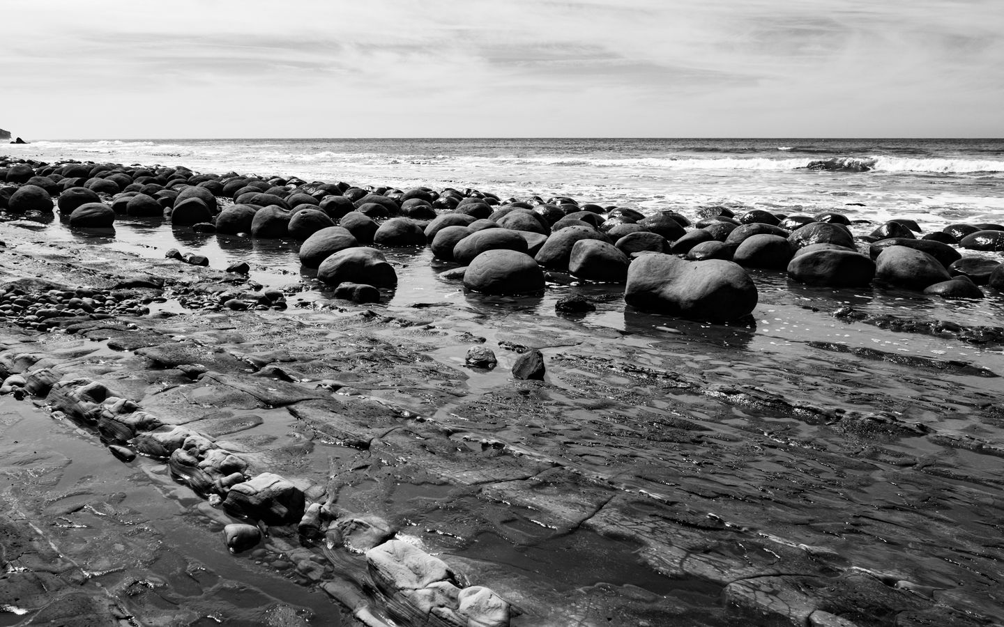 Download 1440x900 stones, sea, water, beach, horizon, bw wallpaper, background widescreen 16:10